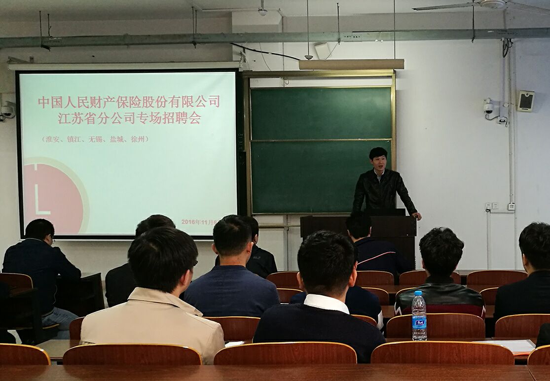 为切实做好公司毕业生就业工作,大力构建毕业生与用人单位的交流平台,积极为用人单位输送应用型人才,公司于11月6日下午2:30在枚乘路校区北苑YFJ0106举办了中国人民财产保险股份有限公司江苏省分公司专场招聘会。