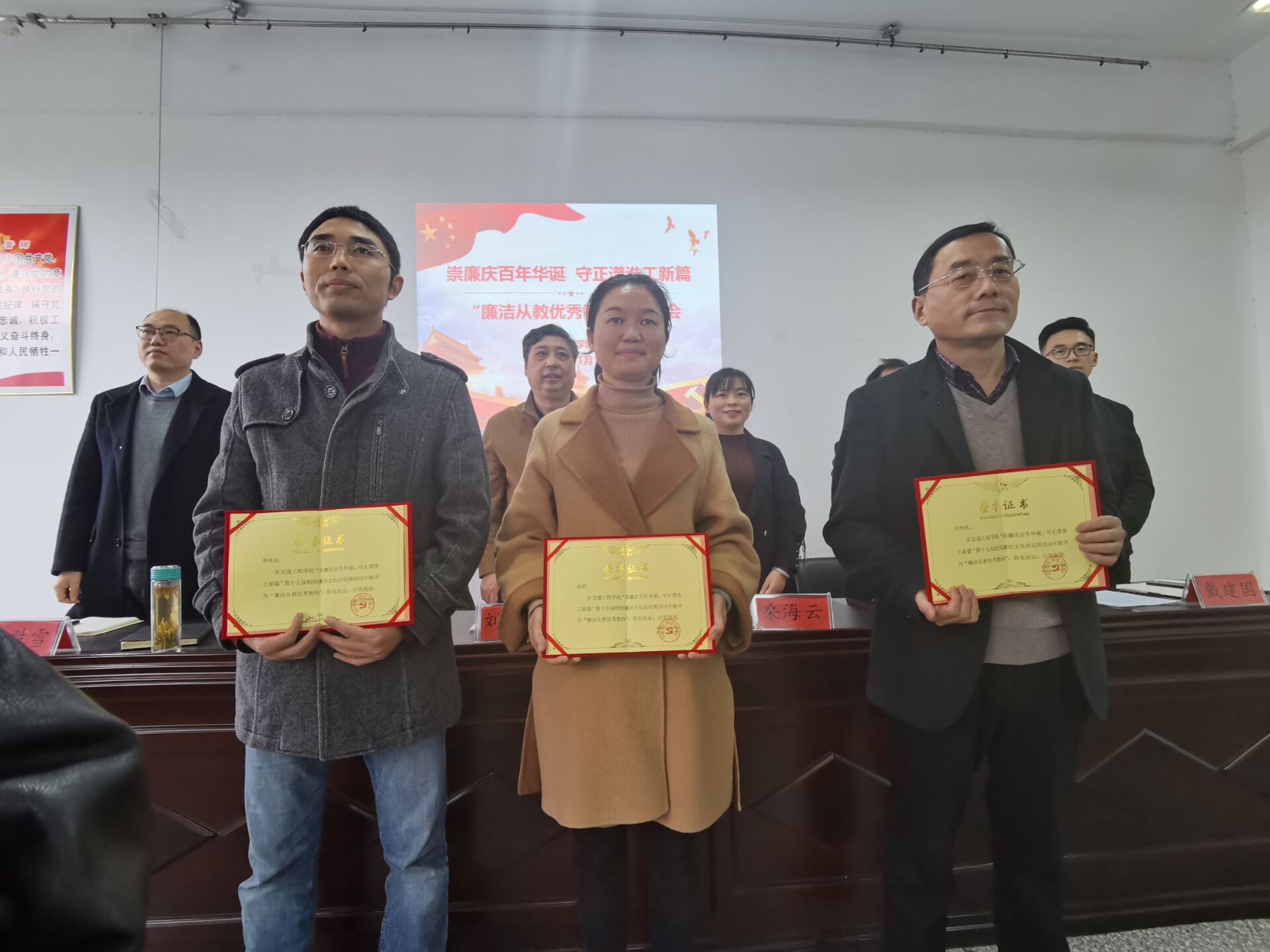 最后,公司各位领导为周桂良、周君、司传胜三位获奖教师颁奖,三位老师表示会继续保持廉洁品质,为教育事业做贡献。