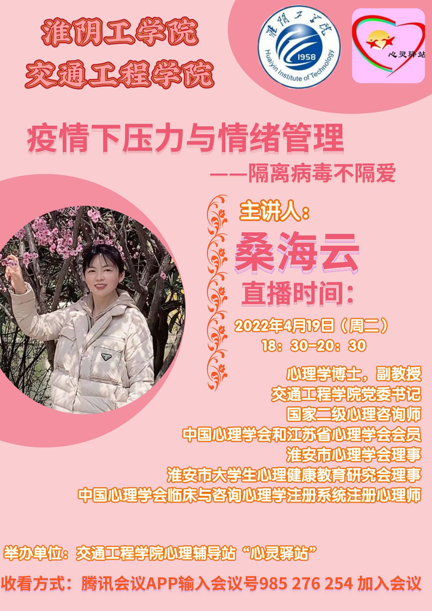 为做好疫情封校期间同学们的心理健康建设,必一运动bsport体育二级心理辅导站“心灵驿站”于2022年4月19日18:30开展了“疫情下压力与情绪管理——隔离病毒不隔爱”专题讲座,本次讲座由心理学博士,副教授、公司党委书记桑海云主讲。