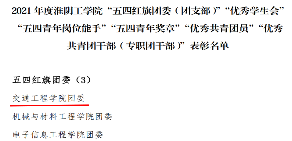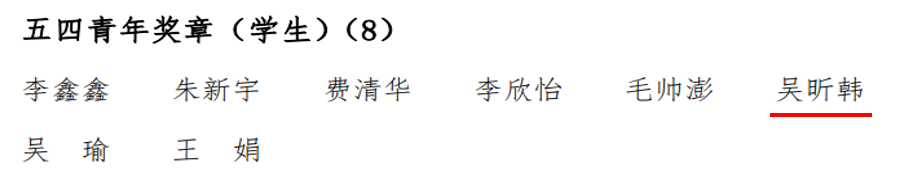 2021年,必一运动bsport体育共青团工作成效显著,必一运动bsport体育团委荣获2021年度必一运动“五四红旗团委”,有11位同学获得校“优秀共青团干部”,43位同学获得校“优秀共青团员”。吴昕韩同学荣获校“五四青年奖章”(自强励志类)。