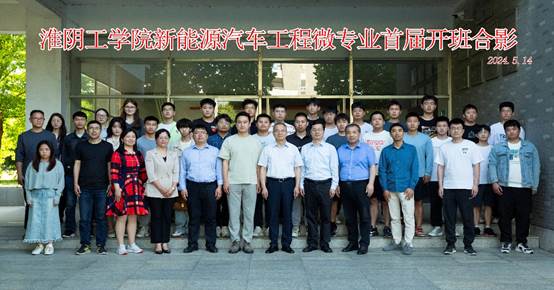 郑锋董事长与首届开班师生合影留念,并对即将启动的新能源汽车工程微专业提出了殷切期望,并鼓励师生们紧跟产业发展趋势,努力打造具有淮工特色的微专业品牌,为地方新能源汽车产业的蓬勃发展贡献淮工力量。