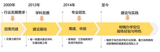 本专业源于1986年江苏省交通厅所属淮海交通专科公司开设的交通管理专业, 2000年因行业发展需求, 形成交通土建方向;2012年依托省一级重点建设学科交通运输工程,学科得到长足发展;2012年,开设了交通工程(道路养护方向),2012-2013招收了两届。2014年获得教育部和江苏省教育厅批准,同年9月开始招生。