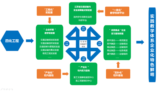 “工程化”实验室,优化实验室布置,再现企业生产流程;“产业化”校内实习基地,企业化改制实训中心,员工培养对接行业需求;“互补化”校外实习基地,协同运输骨干企业,实现优势互补;“一体化”教学科研平台,促进产学研一体化与科教融合。“车辆与交通类虚拟仿真实验教学平台的建设与实践”获批江苏省教学成果奖一等奖。