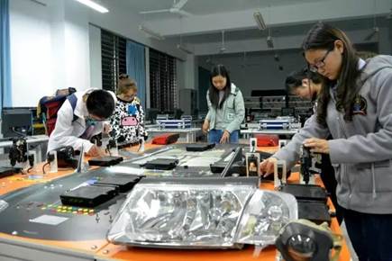 专业依托国家级车辆与交通虚拟仿真实验教学中心、江苏省车辆与交通虚拟仿真共享实验教学平台、车辆与交通省级实验教学示范中心、淮安市电动汽车重点实验室等平台,多方共建教学资源,采用“四式结合,虚实融通”的教学方法,将科研项目与工程案例融入教学环节,借助智能管理系统打造全面开放共享的教学平台。图2为专业同学在汽车电子技术实验室进行汽车电子课程设计。