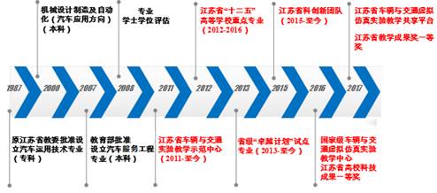 公司汽车服务工程专业于2007年开设,2012年获批江苏省重点专业类,2013年获批省级卓越计划试点专业。专业发展历程如图1。