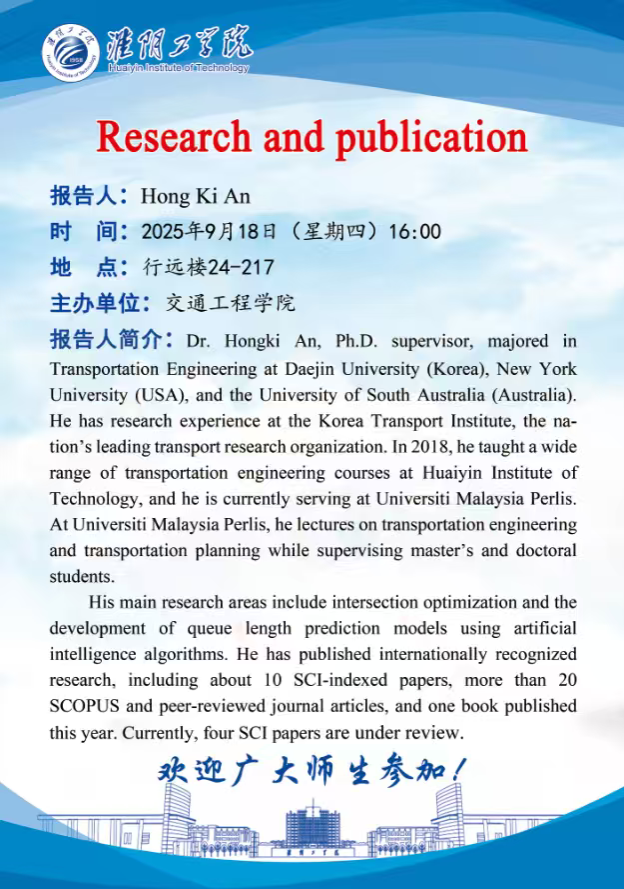 Dr. Hongki An, Ph.D. supervisor, majored in Transportation Engineering at Daejin University (Korea), New York University (USA), and the University of South Australia (Australia). He has research experience at the Korea Transport Institute, the nation’s leading transport research organization. In 2018, he taught a wide range of transportation engineering courses at Huaiyin Institute of Technology, and he is currently serving at Universiti Malaysia Perlis. At Universiti Malaysia Perlis, he lectures on transportation engineering and transportation planning while supervising master’s and doctoral students.
